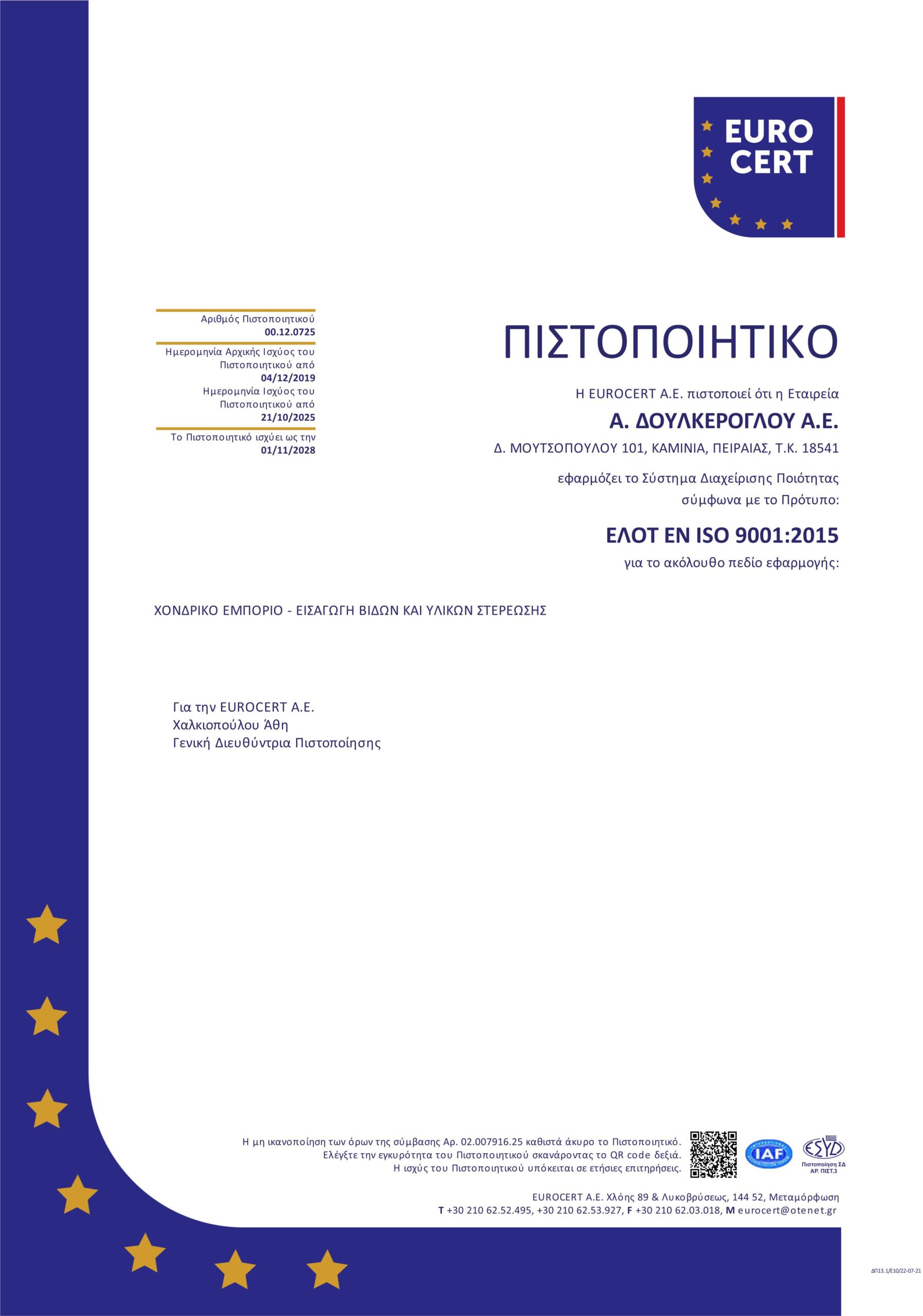 - Να αποτελέσει τη βάση για μια καλύτερη οργάνωση και λειτουργία της εταιρείας Α. ΔΟΥΛΚΕΡΟΓΛΟΥ Α.Ε. και να καλύψει πλήρως τις απαιτήσεις του προτύπου ΕΛΟΤ ΕΝ ISO 9001:2015.